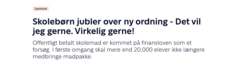 Från och med 2025 kommer mer än 20 000 danska elever serveras gratis skollunch. Den danska regeringen hare avsatt 854 miljoner DKK till en fyraårig nationell testverksamhet som ska utvärdera om skollunch ska införas i alla danska skolor.