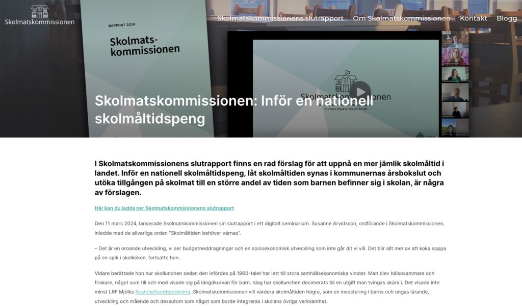 En betydande insats från LRF Mjölks sida har varit finansieringen av den fristående utredningen Skolmatskommissionen. Uppdraget var att se hur fler skolbarn kan ta del av en hälsosam och näringsriktig kost i skolan. I mars presenterades slutrapporten med förslag som att skolmåltider ska synas i kommunernas årsbokslut. Rapporten betonar också vikten av att utöka tillgången på skolmat under en större del av skoldagen för att främja elevernas hälsa och lärande.