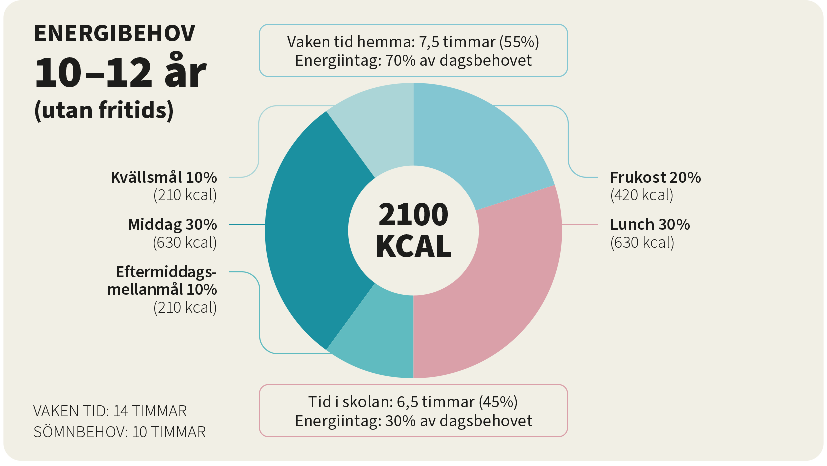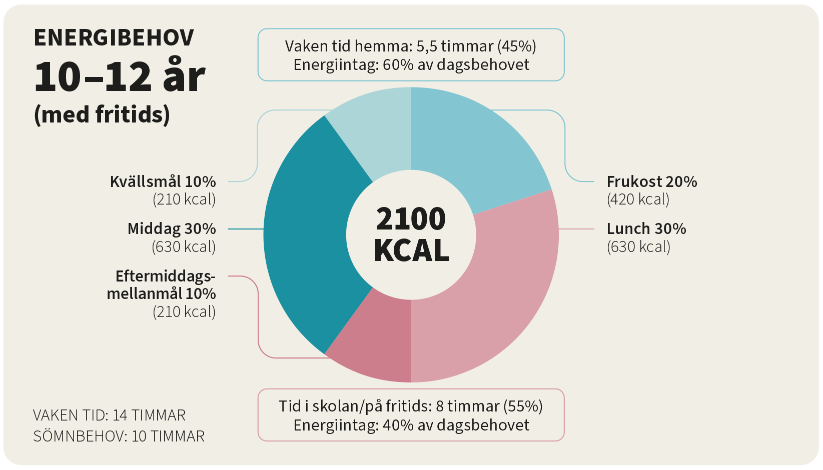 En 10–12-åring behöver omkring 2100 kcal (12) per dag. De som går på fritids på eftermiddagen får mellanmål som bör motsvara cirka 10 procent av energibehovet. Tillsammans utgör lunch och mellanmål då 40 procent av den mängd energi som rekommenderas, och 60 procent återstår att få i sig hemma. Om frukosten motsvarar 20 procent, så återstår 40 procent av energibehovet att täckas av middag och kvällsmat efter skola och fritids.