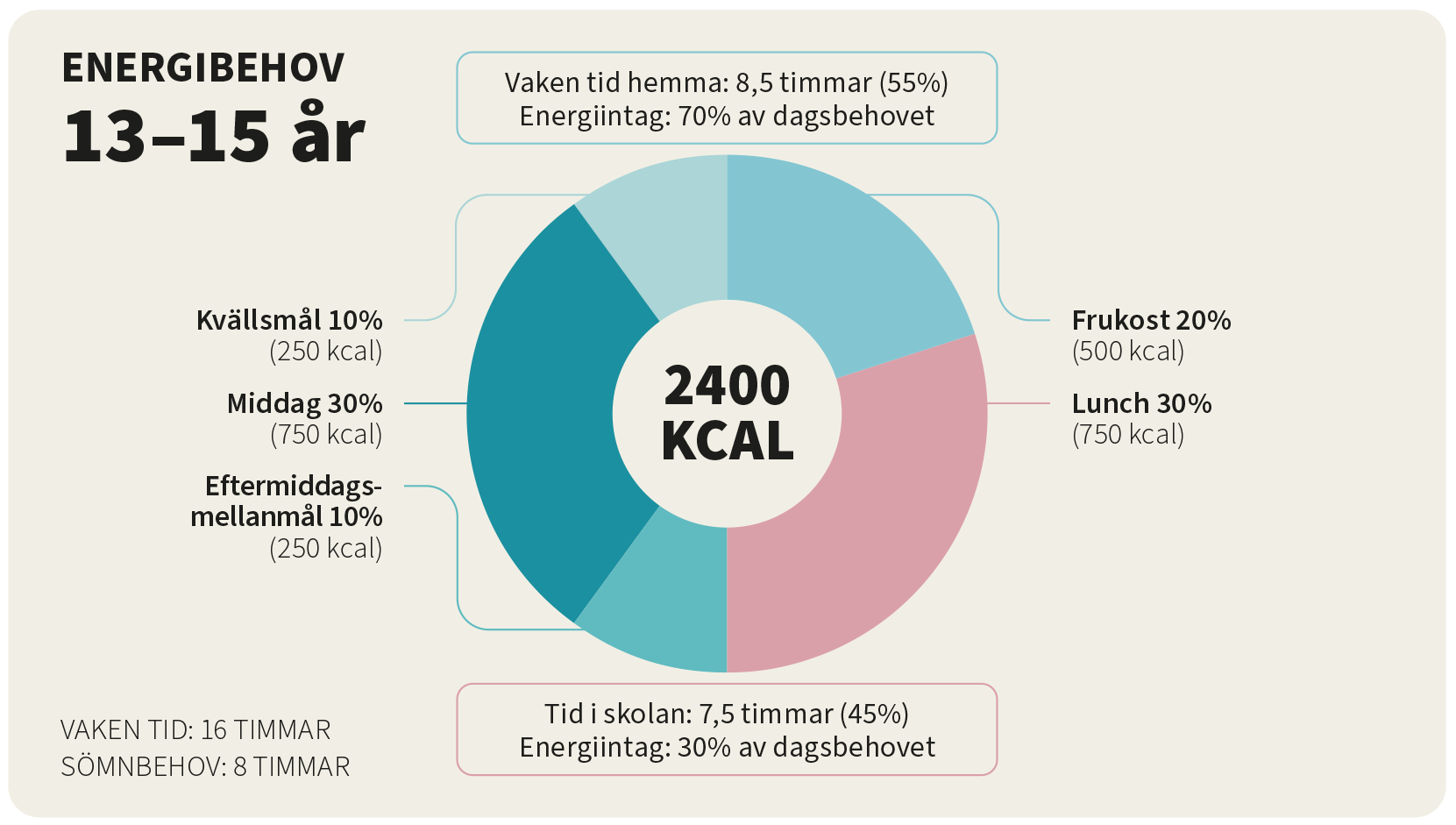 En 13–15-åring behöver omkring 2400 kcal (1) per dag. Högstadieeleverna har störst utmaning att täcka sina energibehov med bra mat under skoldagen. Många av eleverna på högstadiet hoppar över frukosten och vissa väljer bort lunchen eller äter alldeles för lite av den mat som erbjuds i skolan. Högstadieelever går dessutom längre dagar i skolan, och mellanmål erbjuds normalt sett inte.